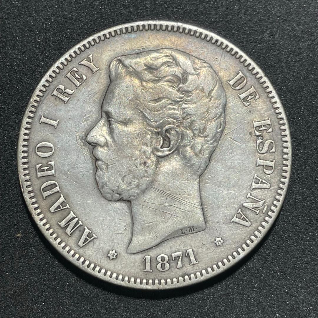 1871年 スペイン 5ペセタ銀貨 アマデオ1世 実測24.73g 本物級 銀貨】1871年 スペイン アマデオ1世 本物 5ペセタ銀貨/短命王の肖像を