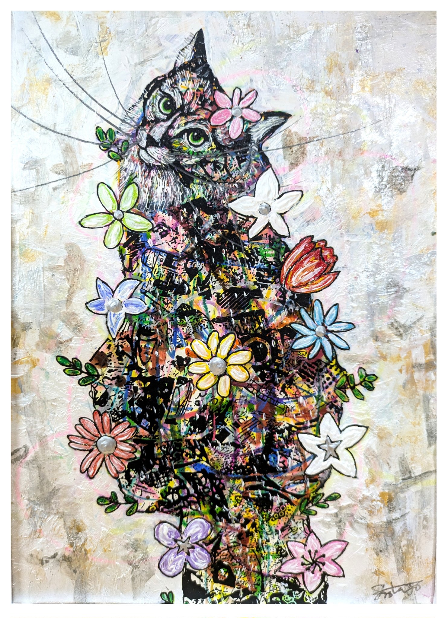 | メーカー | 手作り額付き銅版画カラー作品 title「きらめきニャンコ」 |