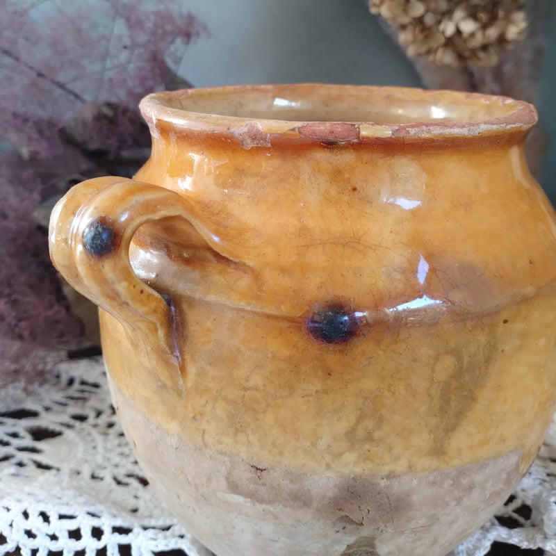 | 商品の特徴 | フランスアンティーク 南仏のポット | フランス アンティーク 食器。French Pottery Pot / 南フランス コンフィポット プロバンス 陶器の壺。fb3b8e94fc66bd4c174dec2720dd84。南仏の明るい雰囲気が魅力のオリーブオイルポット(高さ17cm。数年前に東京のアンティークショップで購入しましたテラコッタに半分黄釉がかかった壺で時代は1900年初めの物との事でした購入価格は35000円ほどでした全体に年代を感じさせる唯一無二の何とも言えない雰囲気に一目惚れでした大切に飾って愛でてきましたが今回コレクションの整理で思い切って出品させて頂きました高さ 14cm口径 11cm底 8cm大きすぎずキッチンなどに置いても素敵だと思います引き続き大切にして頂ける方に | ||