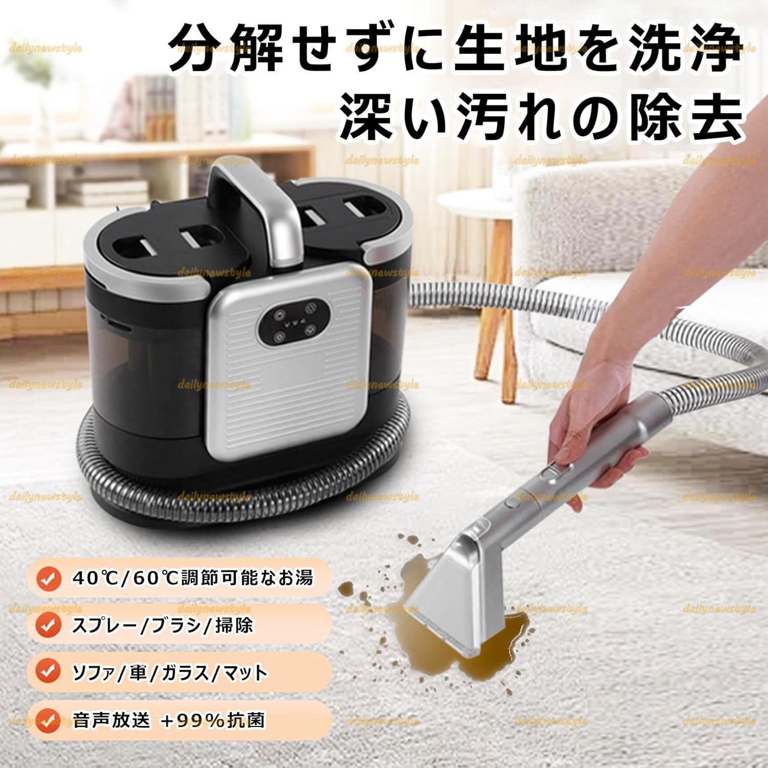 | 商品の特徴 | カーペットクリーナー 15000Pa強力吸引 加熱式 布洗浄機 染み抜き。Amazon.co.jp: Yadea R3 カーペットクリーナー18000Pa 超強吸引力。ottostyle.jp カーペットクリーナー バキュームクリーナー カーペット。ご覧いただきありがとうございます♡❣️1点限り❣️早い者勝ちです✨️ ★即購入歓迎 ★安心の匿名発送おまとめ割あり❣️フォロー割あり❣️#aoaoroom1,000円〜4,999円→100円引き5,001円以上→200円引き(1,000円以上の商品が対象)フォローして頂き、【フォロー割引希望】とコメントください。ケルヒャー 高圧洗浄機 K 2 サイレント洗車セット/オリジナルボックス付き。従来品はお湯を清水タンクに注水する必要があり、水温を一定に保つことができなくてうっかりすると大変なことになってしまう。ダイソンコードレス掃除機V10-SV12専用ドックフル装備。 ※【最大15000PA強力吸引!頑固な汚れを退治しよう】最大15000PA吸引力で布製品に長年蓄積した埃/シミ/カビ/あぶら、子供の食べこぼし、ペットの吐瀉物/粗相/足跡、蓄積された頑固な汚れを奥からどんどん吸い出せる。【新品】UWANT スチームリンサー 高温スチーム&温水洗浄 カーペット/ソファ。※お勧めの洗浄アイテム:アルカリ電解水、重曹、クエン酸) ※【多様な付属品をご提供!より便利に使える】LEDタッチパネルで操作できる!11000Pa標準モードと15000Pa強力モードがあり、加熱温度は40℃と60℃が設定可能、洗浄対象によって簡単に選べる。楽天市場】【史上最安値!最終在庫!】 YINO life 布製品 洗浄機。フォローの確認がとれましたら価格変更させて頂きます。*-*-*-*-*-*-*-*-*-*-*-*-*-*-*-*-*-*-*-*-*新品、未使用✨ ※【最高60℃まで加熱可能!汚れが落ちやすい】本製品は定温加熱機能が搭載し、15秒だけで最高60℃のお湯が出来上がりより簡単に布製品を清浄できる。Dyson SV12 コードレス掃除機 ホワイト/オレンジ。新品 レイコップ 収納スタント付 LEDヘッド コードレス掃除機 ROV-100。加熱式なら注水・保温の問題を解決! ※【布製品を水洗い!水だけでキラキラの状態へ蘇る】本製品は丸洗いできないほとんどの布製品を洗浄できる家庭用カーペットクリーナーです。適用範囲:敷布団、布製ソファー、布製イス、絨毯、カーペット、ラグ、フロアマット、カーテン、車のシート、布製マットレス、ぬいぐるみ、ペットシートなど。ルンバ ロボット掃除機本体 ブラックxグレー RVD-Y1。Dyson/ダイソン スティッククリーナー本体。(当製品は洗剤使用可能のタイプです。ひどい汚れの場合、洗剤と併せてご使用お勧めです。HITACHI バッテリー PVB-2525A 未使用。新品未開封 KARCHER OC HANDY COMPACT ハンディエア。【60度お湯生成×15000Pa強力吸引】Yadea R6 クリーナー 加熱式 布洗浄機 染み抜き ソファクリーナー 絨毯クリーナー 水洗い 車用掃除機 スチーム バキュームクリーナーソファ洗浄 布製品/ペットシート/車内/ラグ/ソファ/絨毯/ぬいぐるみ/掃除用品【テレビ放映商品】1374 | ||